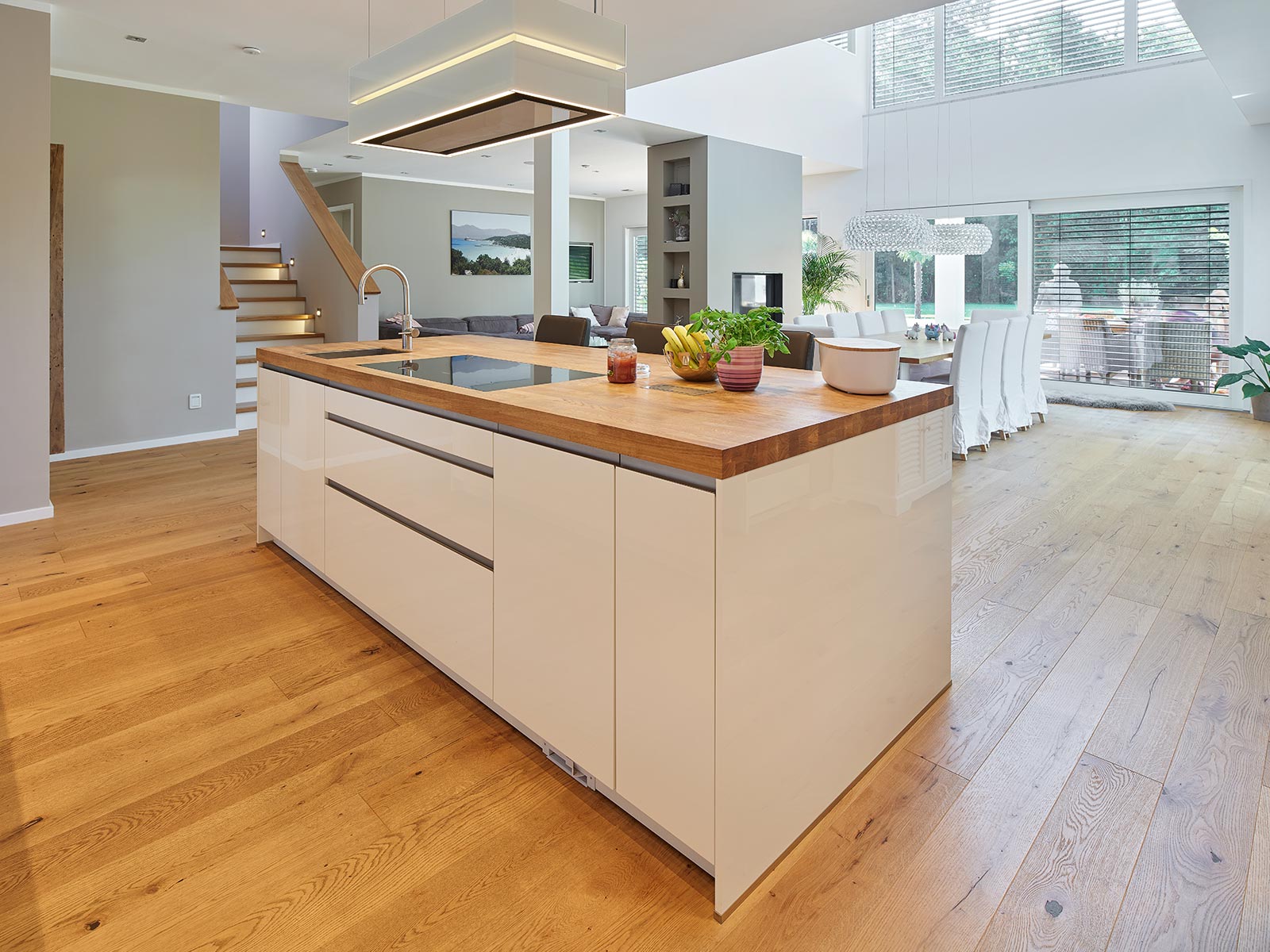 Offenes Kuchenkonzept Mit Kochinsel Als Zentraler Raum Fur Die Ganze Familie Moderne Kuche Haus Kuchen Kuche Holzboden